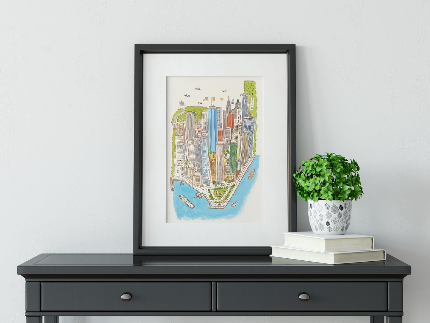Downtown Manhattan Art Print, NYC Cityscape Illustration, 8x10β Matted Wall Art, New York Skyline, Urban Decor, Office Gift